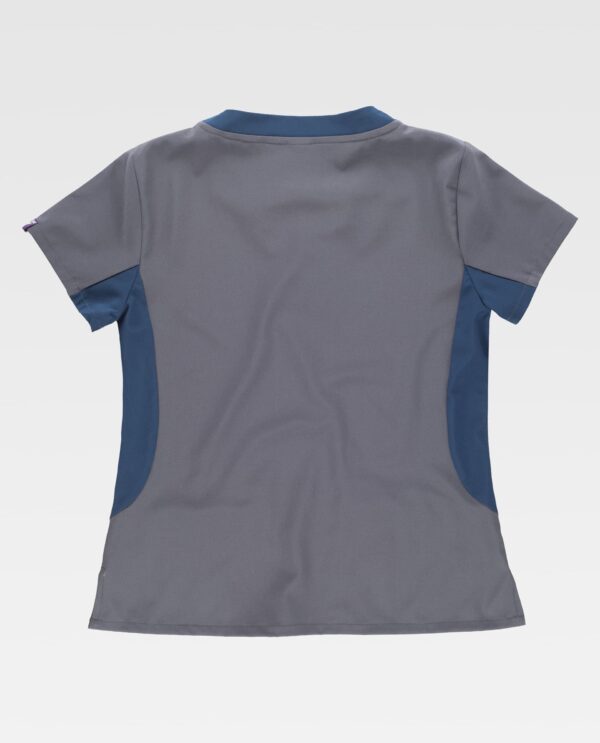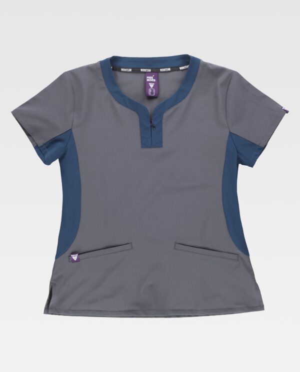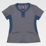 Túnica entalhada de senhora combinada, manga curta com tecido elástico. Gola redonda con cremalheira. Dois bolsos interiores laterais. Aberturas nos laterais.