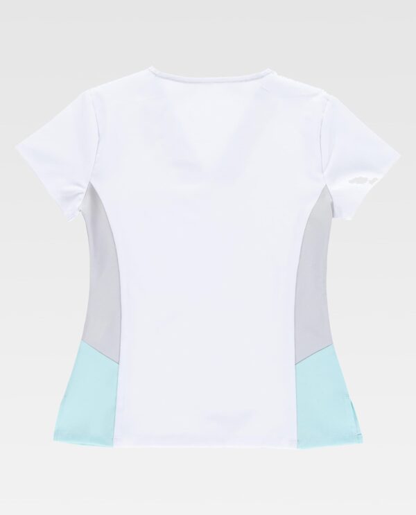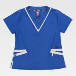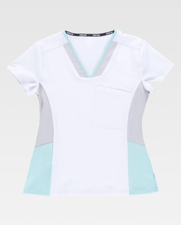 Túnica entalhada de senhora combinada, manga curta com tecido elástico. Gola a bico com biés combinado. Um bolso de chapa no peito. Um bolso para canetas. Aberturas nos laterais.