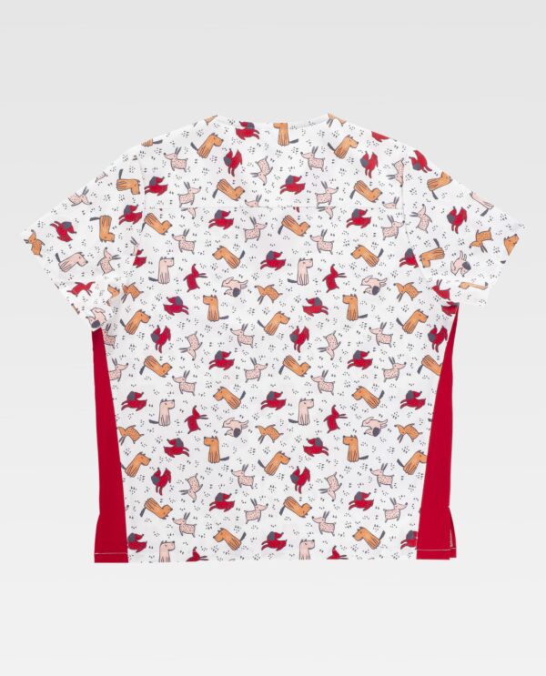 Túnica combinada unisex de manga curta com elástico e tecido estampado. Decote em V. Encaixe nas costas. Dois bolsos duplos laterais de chapa. Abertura nos laterais.