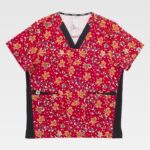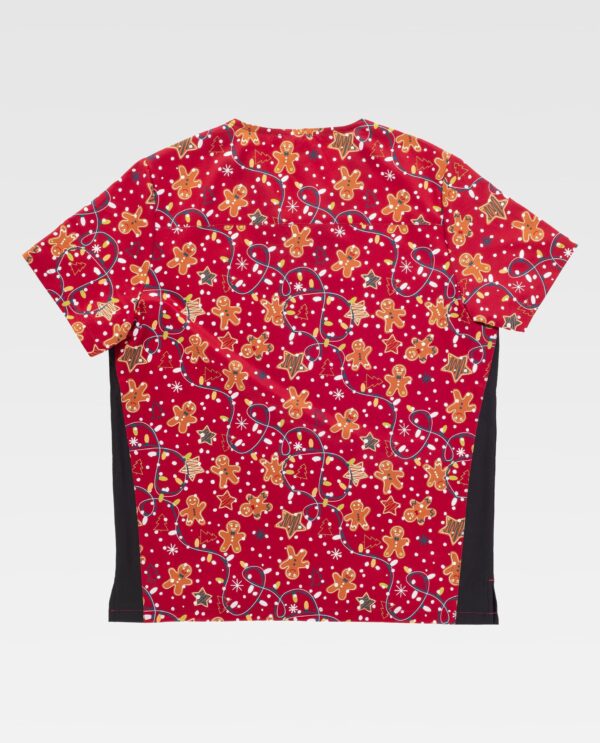 Túnica combinada unisex de manga curta com elástico e tecido estampado. Decote em V. Encaixe nas costas. Dois bolsos duplos laterais de chapa. Abertura nos laterais.