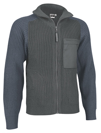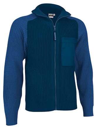 Casaco em malha reforçado com gola alta, fecho de correr completo e desenho bicolor. Confecionado em tecido respirável de tricot grosso 100% acrílico Gauge 5 de tato agradável ao toque e com alta retenção térmica. Gola, cintura e punhos em canalé elástico que se adapta confortavelmente ao corpo. Reforços de sarja nos cotovelos e bolso no peito para maior durabilidade em zonas de maior desgaste. Dois bolsos laterais e um bolso vertical esquerdo no peito com fecho de correr para ter tudo acessível e para realçar a marca. Métodos adequados de marcação: serigrafia, bordados, cosidos. Ideal como roupa de trabalho na estação de inverno ou em ambientes frios.