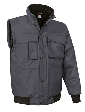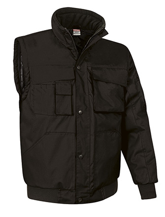 Casaco destacável multibolsos bicolor, que podem ser convertido em colete. Confecionado com tecido impermeável Canvas no exterior, forro interior liso e acolchoado interno que proporciona retenção térmica. Casaco facilmente convertível em colete removendo as mangas que são fixadas por fechos. Punhos e cintura em canalé elástico grosso que se adapta confortavelmente ao corpo. Dois bolsos frontais de canguru divididos, dois bolsos superiores com pala e velcro (à esquerda com fecho de correr para facilitar a marcação), um bolso para caneta, um pequeno bolso para acessórios, para ter tudo acessível. Acesso com fecho na parte interior das costas para facilitar a marcação: serigrafia, transfer, vinil, bordados, cosidos. Ideal como roupa de trabalho, roupa desportiva e têxteis publicitários.