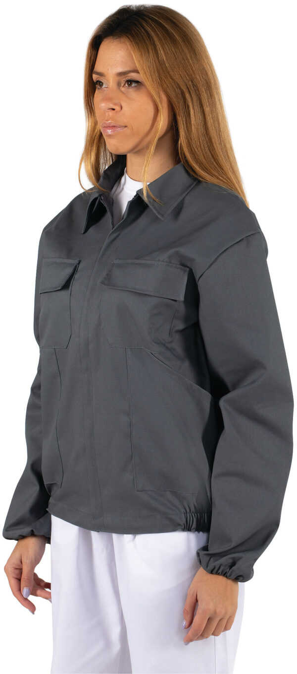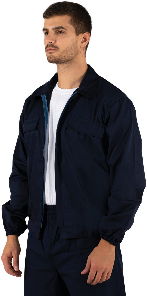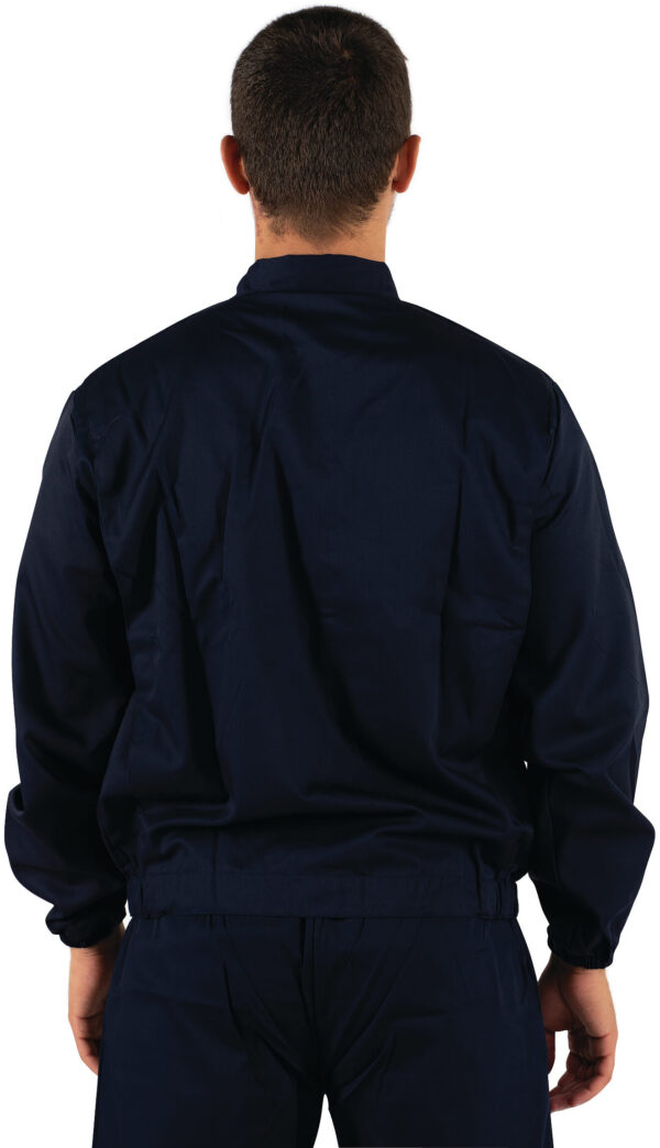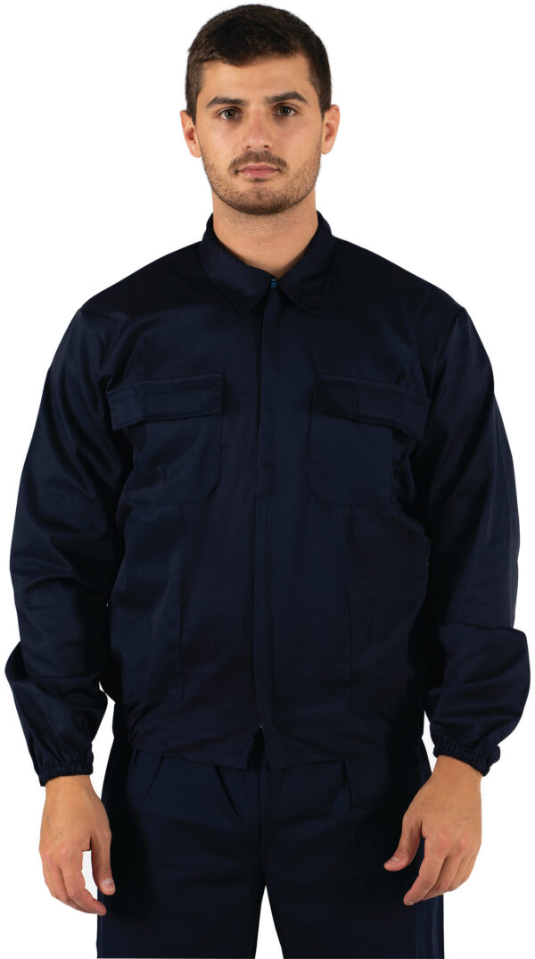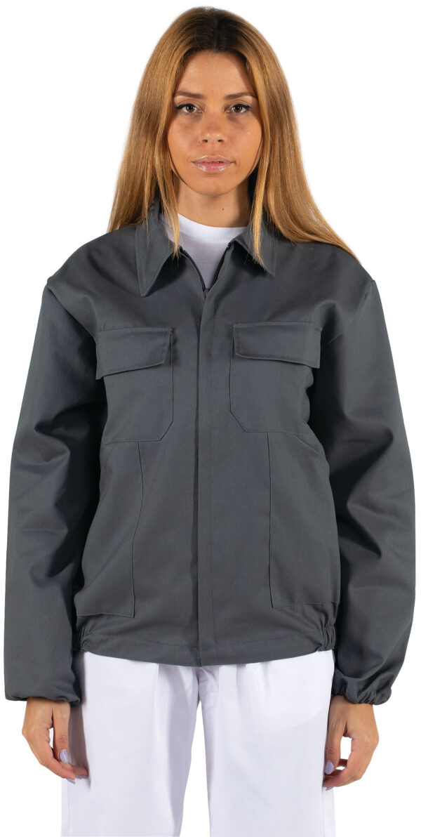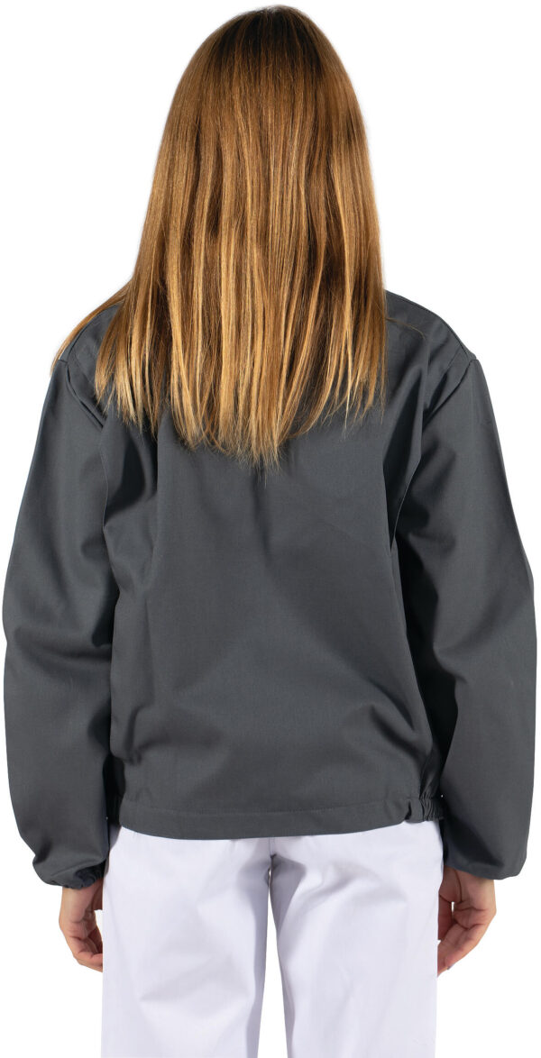Casaco em sarja;65% Poliester 35% Algodão de 240 g.Fecho zipper oculto por aba;Dois bolsos no peito e dois bolsos laterais;Elástico na cintura e nas mangas.