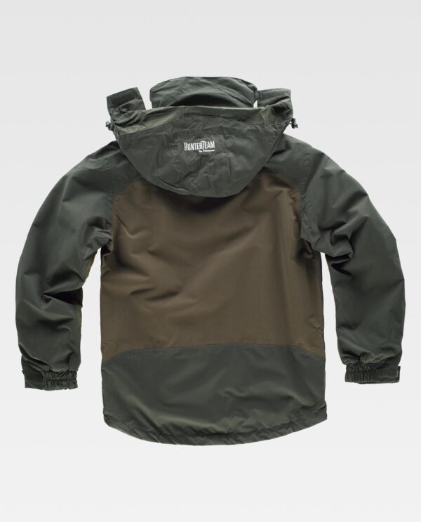 Casaco impermeável combinado. Gola alta e capuz desmontável com cordão elástico e peça ajustável. Abrange nas costuras no interior da gola. Fecho de correr de náilon. Aba protetora interior. Dois bolsos laterais interiores com fecho de correr de náilon. Punho com elástico e ajuste de velcro. Cortes decorativos e fechos de correr de fecho inverso. Revestido.