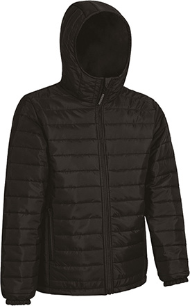 Casaco com capuz e efeito térmico. Confecionado em tecido Loft leve, e acolchoado com exterior plano repelente à água, forro interior e acolchoado que proporciona maior isolamento térmico. Gola alta com fecho de correr completo incluindo protetor do queixo para maior calor e conforto. Cintura com cordão regulador e stoppers para um melhor ajuste. Dois bolsos verticais na cintura com fecho de correr e um interior com velcro para ter tudo acessível. Acesso com fecho na parte interior das costas para facilitar a marcação: serigrafia, transfer, vinil, bordados, cosidos. Ideal como têxteis publicitários e roupa casual.
