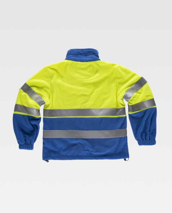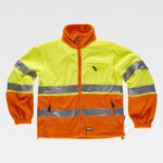 Casaco polar combinado com fitas refletoras. Parte superior de alta visibilidade. Gola alta e fecho de correr de náilon. Um bolso no peito e dois bolsos laterais interiores com fecho de correr de náilon. Duas fitas refletoras no peito, nas costas e nas mangas. Punho com elástico. Cordão elástico com peça ajustável no baixo.