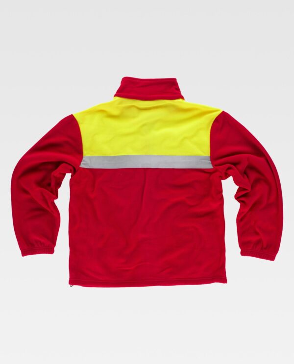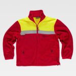 Casaco polar combinada com fitas refletoras. Parte superior de alta visibilidade. Gola alta e fecho de correr de náilon. Um bolso no peito e dois bolsos laterais interiores com fecho de correr de náilon. Uma fita refletora no peito e nas costas. Punho com elástico. Cordão elástico com peça ajustável no baixo.