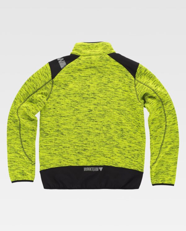 Casaco de ponto combinado. Gola alta com fecho de correr em nylon. Aba interior de proteção virada para cima que cobre o fecho de correr. Dois bolsos laterais interiores com fecho de correr. Um bolso no peito com fecho de correr em plastão. Fita decorativa personalizada no ombro. Punhos e bainha com elástico.