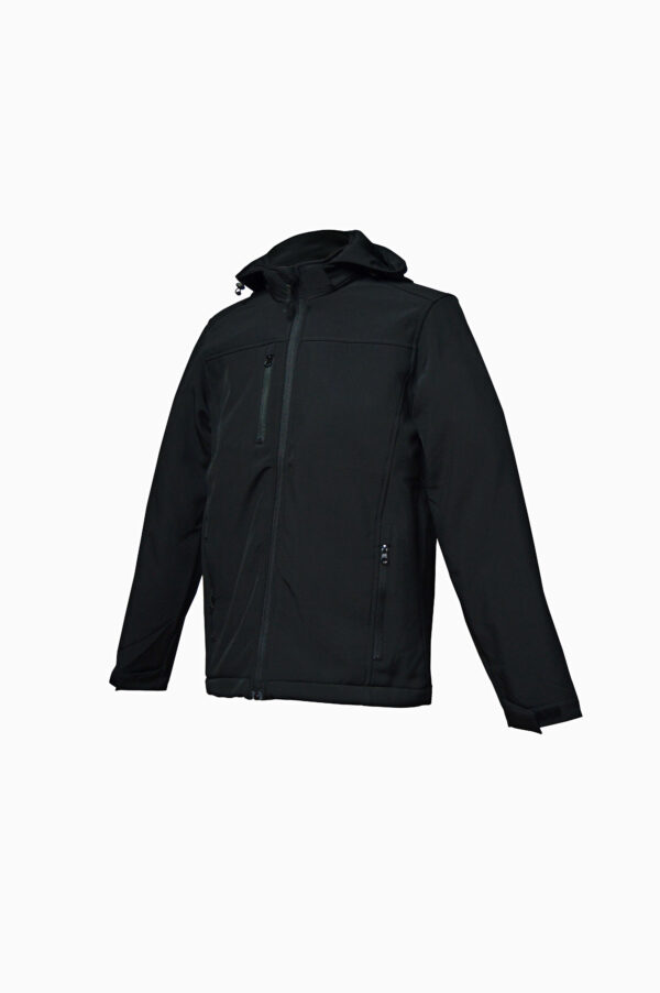 Casaco em softshell de 300 g;Capuz removível;Punhos com ajuste;3 bolsos;Repele a àgua.