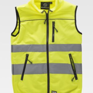 Casaco softshell de Visibilidade Aumentada. Confecionado em tecido de três camadas com efeito corta-vento, repelente à água e alto efeito de retenção térmica, inclui duas fitas retro-refletoras cosidas no tronco, costas e mangas para maior segurança. Vestuário certificado como EPI de Categoria II de Visibilidade Aumentada de acordo com as normas 13688 e 17353, tipo B3 para visibilidade noturna, duração máxima de 25 lavagens. Gola alta de dupla camada com fecho de correr completo incluindo protetor de queixo para maior calor e conforto. Punhos rectos, cintura com cordão regulador e stoppers para um melhor ajuste e dois bolsos inclinados com fecho de correr para ter tudo acessível. Métodos adequados de marcação: bordados, cosidos e termo-adesivos anti-sublimação. Ideal como roupa de trabalho e uniformes profissionais.