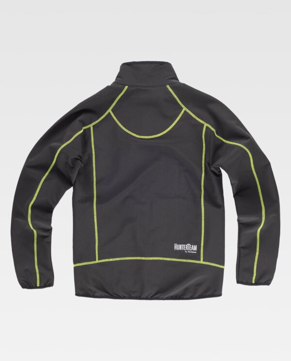 Casaco com costuras planas em contraste, manga raglã. Gola alta y fecho de correr de nylon. Dois bolsos no peito e dois bolsos internos laterais com fecho de correr de nylon. Fercho de correr invertido. Gola, punhos e baixo com debruns elásticos.