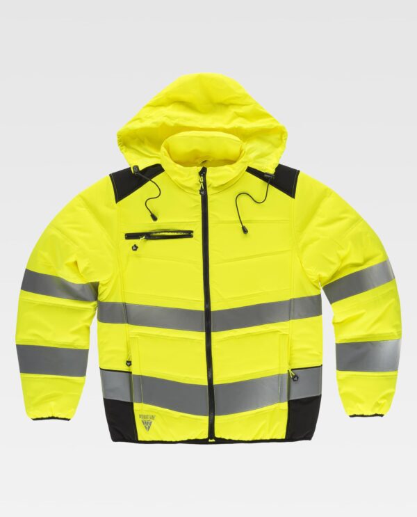 Casaco combinado acolchoado com alta visibilidade e fitas refletoras. Gola alta e capuz enrolável com cordao para ajustar. Fecho de cremalheira. Lapela protetora interior à volta na parte superior cobrindo à cremalheira. Dois bolsos inseridos laterais com fecho de cremalheira. Um bolso inserido no peito com fecho de correr. Duas fitas refletoras de diferente tamanho no peito, costas e mangas. Punhos e bainha com bies elástico em contraste.