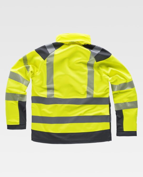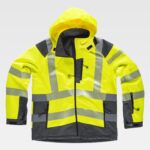 Casaco Workshell de alta visibilidade combinada com fitas refletoras. Gola alta forrada com polar e capuz enrolável com cordão ajustável. Cremalheira de nailon de fecho inverso. Lapela protetora interior na parte superior cobrindo o puxador. Dois bolsos laterais inseridos com cremalheiras de nailon. Um bolso no peito e outra na manga com cremalheira. Fitas refletoras segmentadas termo-adesivas no peito, ombros, costas e mangas. Duas fitas cosidas nas costas e laterais. Fita decorativa personalizada na manga. Punho ajustável com velcro. Cordão elástico com peça ajustável na parte inferior. Tecido corta ventos, repelente de água e resistente ao rasgo com membrana interior transpirável, isolante e interior de alta capacidade térmica. Tecido interior suave, com forro de rede adiante.