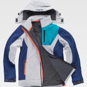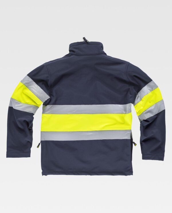 Casaco Workshell combinado de fitas refletoras. Gola alta e fecho de correr. Aba protetora interior com volta na parte superior protegendo o fecho de correr. Um bolso no peito e dois laterais interiores de fecho de correr. Duas fitas refletoras no peito, nas costas e nas mangas com peça central de alta visibilidade. Punhos ajustáveis com velcro. Cordão elástico com peça ajustável na gola e no baixo. Tecido corta-ventos, repelente à água e resistente ao rasgo com membrana interior transpirável e isolante no interior de alta capacidade térmica.