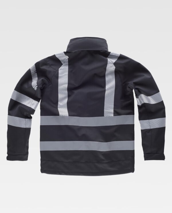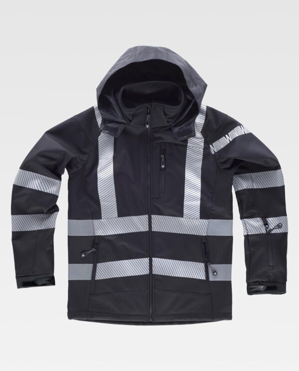 Casaco Workshell com fitas refletoras. Gola alta forrada com polar e capuz enrolável com cordão ajustável. Cremalheira de nailon de fecho inverso. Lapela protetora interior na parte superior cobrindo o puxador. Dois bolsos laterais inseridos com cremalheiras de nailon. Um bolso no peito e outra na manga com cremalheira. Duas fitas refletoras segmentadas termo-adesivas no peito, ombros, costas e mangas. Fitas cosidas nas costas e laterais. Fita decorativa personalizada na manga. Punho ajustável com velcro. Cordão elástico com peça ajustável na parte inferior. Tecido corta ventos, repelente de água e resistente ao rasgo com membrana interior transpirável, isolante e interior de alta capacidade térmica. Tecido interior suave, com forro de rede adiante.