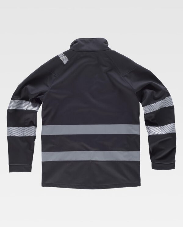 Casaco Workshell com fitas refletoras. Gola alta e fecho de cremalheira de nailon de fecho inverso. Lapela protetora interior na parte superior cobrindo o puxador. Dois bolsos laterais inseridos com cremalheiras de nailon. Duas fitas refletoras segmentadas termo-adesivas no peito e mangas. Duas fitas cosidas nos lateriais e nas costas. Fita decorativa personalizada no ombro. Punho ajustável com velcro. Cordão elástico com peça ajustável na parte inferior. Tecido corta ventos, repelente de água e resistente ao rasgo com membrana interior transpirável, isolante e de alta capacidade térmica. Tecido interior suave, com forro de rede adiante.