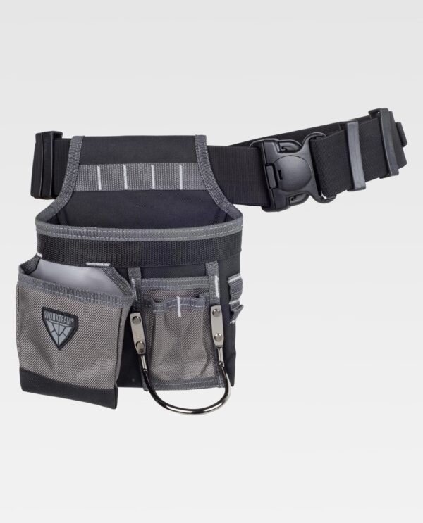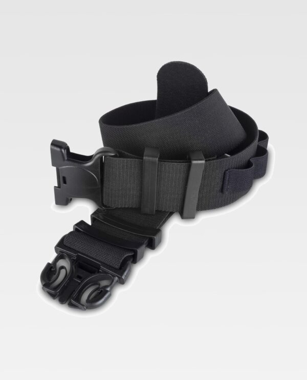 Cinto tático com fivela de pressão. Facilmente ajustável a diferentes tamanhos com dois ajustadores internos de velcro nas extremidades e quatro presilhas. Cinta elástica compartimentada para pendurar objectos. Contorno de 110cm máximo.