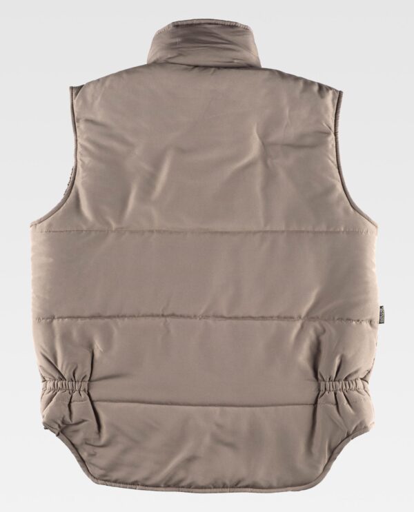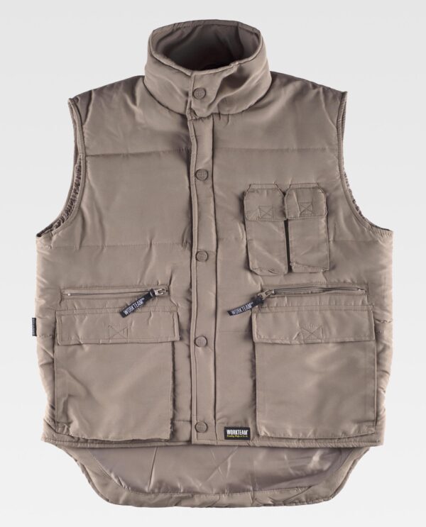 Colete acolchoado de gola alta. Fecho de correr de náilon oculto por aba de presilhas. Dois bolsos no peito com fole e lapela de velcro. Dois bolsos interiores com fecho de correr nos costados. Dois bolsos laterais com fole e lapela de velcro. Um bolso de chapa no peito com fecho de velcro no interior. Cavas ajustáveis. Elástico nos laterais na cintura.
