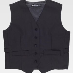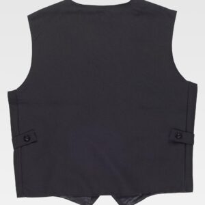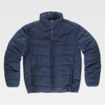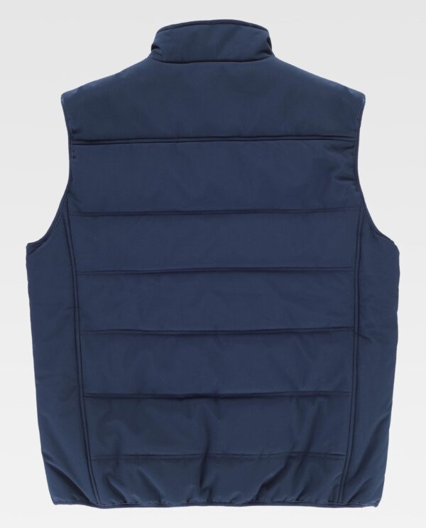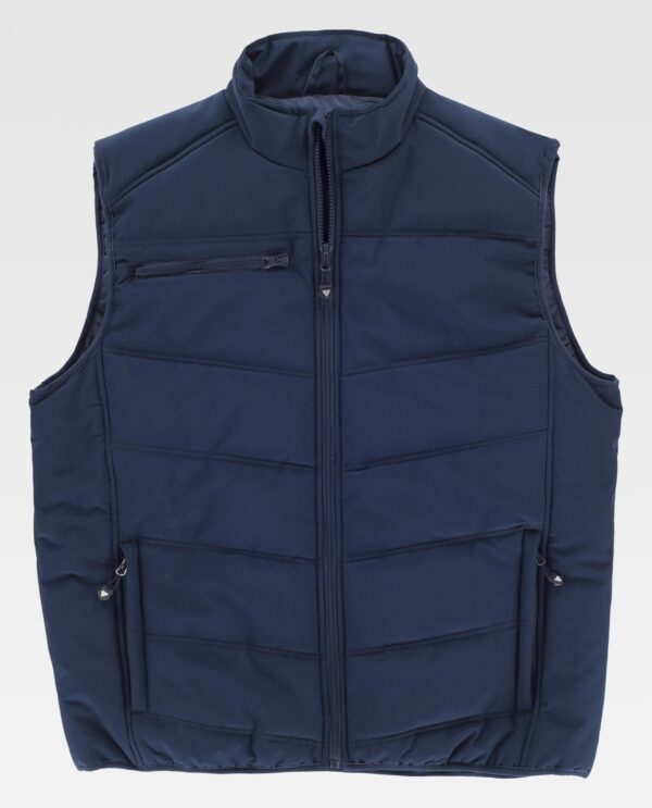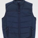 Colete acolchoado. Gola alta com fecho de cremalheira. Lapela protetora interior à volta na parte superior cobrindo à cremalheira. Dois bolsos inseridos laterais com fecho de cremalheira. Um bolso inserido no peito com fecho de correr. Debrun com bies elástico.