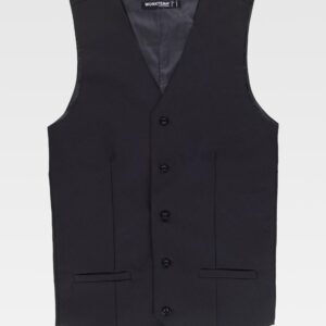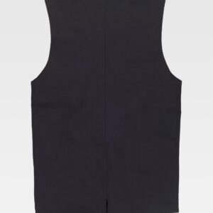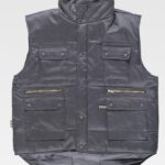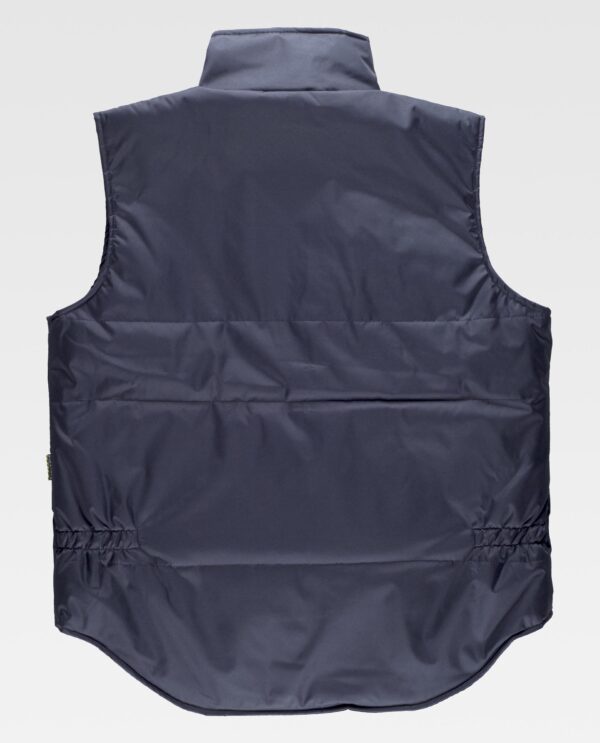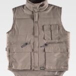 Colete acolchoado de gola alta em tecido Oxford. Fecho de correr de náilon oculto por aba de presilhas. Um bolso no peito e dois laterais interiores com fecho de correr. Dois bolsos com fole e lapela de presilhas nos costados. Um bolso de chapa no peito com fecho de velcro no interior. Cavas ajustáveis. Elástico nos laterais nas costas.