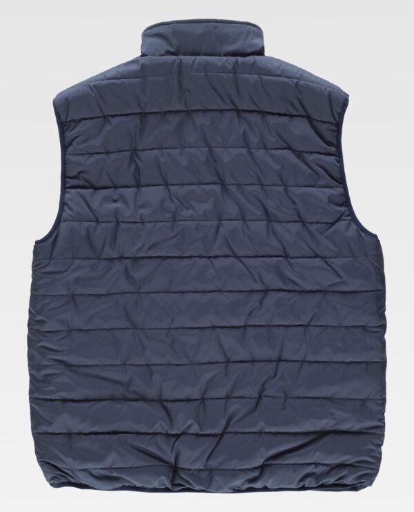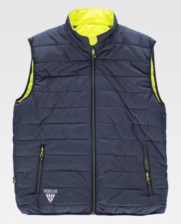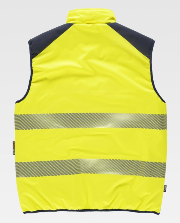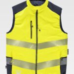 Colete acolchoado reversível. Gola alta com fecho de cremalheira de náilon. Aba protetora cobrindo a cremalheira. Debrun com bies elástico em contraste. Exterior: Combinado com alta visibilidade e fitas refletoras segmentadas. Dois bolsos inseridos laterais com fecho de cremalheira. Duas fitas refletoras segmentadas termo-adesiva no peito e nas costas. Gancho na parte traseira da gola. Interior: Acolchoado. Dois bolsos laterais inseridos com fecho de cremalheira.