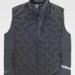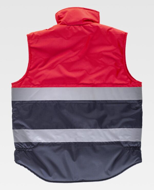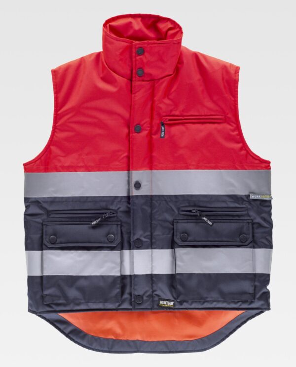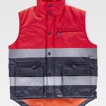 Colete combinado acolchoado em tecido Oxford de gola alta com fitas refletoras. Parte superior de alta visibilidade. Fecho de correr oculto por aba com presilhas. Um bolso no peito e dois laterais interiores com fecho de correr. Dois bolsos com fole e lapela de presilhas nos costados. Um bolso no peito de chapa com fecho de velcro no interior. Duas fitas refletoras no peito e nas costas. Cavas ajustáveis. Elástico nos laterais da cintura.