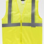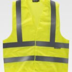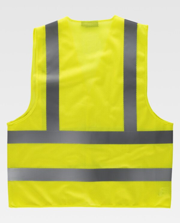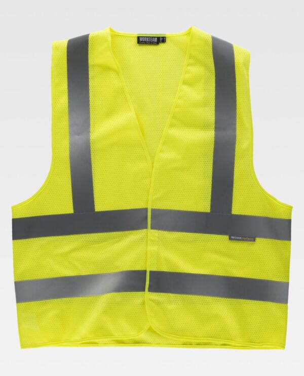 Colete em rede de alta visibilidade com fitas refletoras. Decote em bico e fecho de velcro adaptável. Uma fita refletora nos ombros e duas no peito e nas costas. Acabado com bainhas.