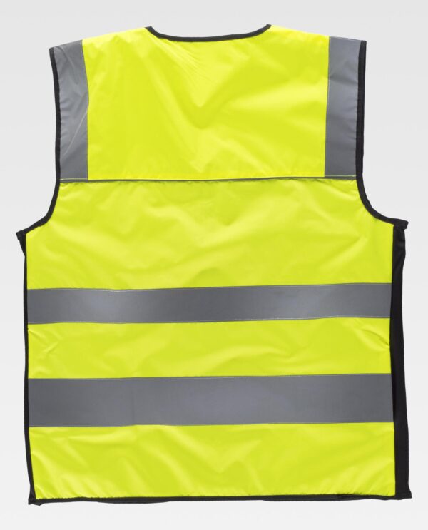 Colete de alta visibilidade em tecido Oxford com corpetes e fitas refletoras. Decote em bico e fecho de correr. Dois bolsos no peito interiores, um bolso de chapa com bolso transparente para identificador e um bolso de fole, todos com fecho de correr. Uma fita refletora nos ombros e duas no peito e nas costas de diferentes tamanhos. Adaptável com tecido elástico nos laterais. Debruns refletores. Bainhas em contraste. Revestido de rede no interior.