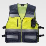 Colete em tecido Oxford com ajustes laterais e fitas refletoras. Decote em bico e fecho de correr de náilon. Fita tecida em contraste, um bolso de chapa e um bolso de fole com lapela de velcro no peito. Sistema de retenção para emissoras. Dois bolsos laterais de fole com fitas refletoras e fecho de correr. Bolso traseiro com fecho de correr. Fivelas reguláveis laterais. Uma fita refletora no peito e nas costas. Acabado com bainhas em contraste. Revestido de rede no interior.