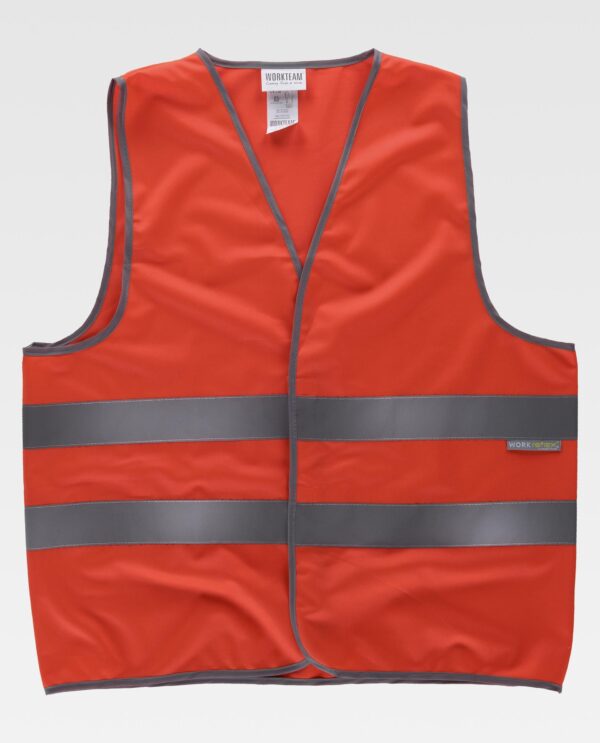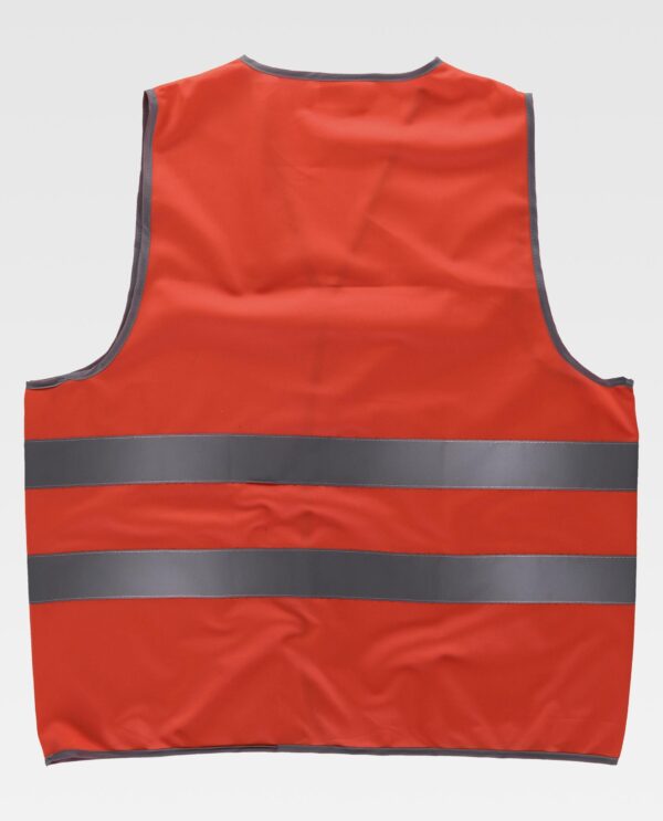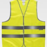 Colete de alta visibilidade com fitas refletoras. Decote em bico e fecho de velcro adaptável. Duas fitas refletoras no peito e nas costas. Acabado com bainhas em contraste.