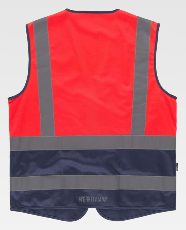 Colete combinado com fitas refletoras. Parte superior de alta visibilidade. Decote em bico e fecho de correr de náilon. Um bolso de fole com lapela de velcro no peito e passador com argola de plástico. Um bolso no peito transparente para identificador pessoal. Dois bolsos laterais com fole e fecho de velcro. Uma fita refletora nos ombros e dois no peito e nas costas. Bainhas em constraste.