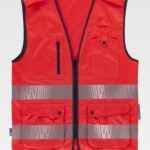 Colete combinado com fitas refletoras. Parte superior de alta visibilidade. Decote em bico e fecho de correr de náilon. Um bolso de fole com lapela de velcro no peito e passador com argola de plástico. Um bolso no peito transparente para identificador pessoal. Dois bolsos laterais com fole e fecho de velcro. Uma fita refletora nos ombros e dois no peito e nas costas. Bainhas em constraste.