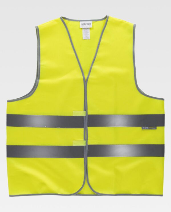 Colete de alta visibilidade com fitas refletoras. Decote em bico e fecho de velcro adaptável. Duas fitas refletoras no peito e nas costas. Acabado com bainhas em contraste.
