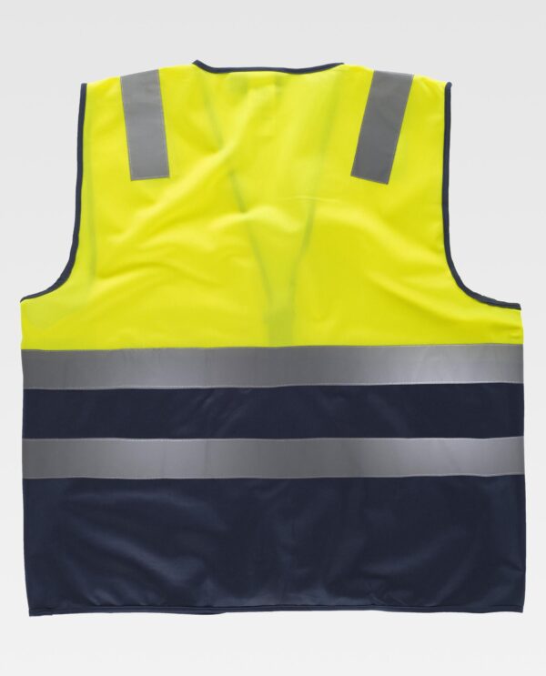 Colete combinado com fitas refletoras. Parte superior de alta visibilidade. Decote em bico e fecho de correr de náilon. Um bolso no peito transparente para identificador pessoal. Uma fita refletora nos ombros e duas no peito e nas costas. Acabado com bainhas.