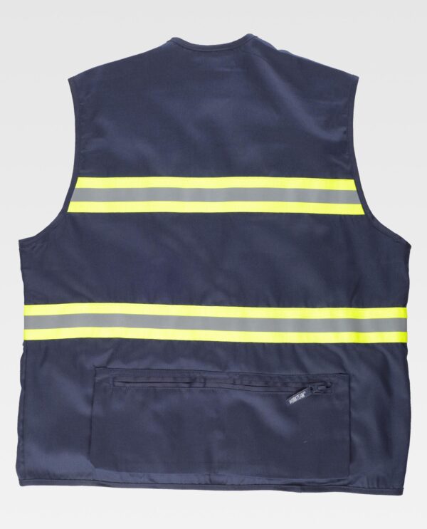 Colete tipo safari com fitas refletoras-fluorescentes. Decote em bico e fecho de correr de náilon. Três bolsos no peito de diferente tamanho com fole e lapela de velcro. Argola metálica no bolso superior. Dois bolsos laterais com fole e fecho de correr nos costados. Bolsos auxiliares sobrepostos com lapela de velcro. Bolso traseiro com fole e fecho de correr. Duas fitas fluorescentes com uma fita refletora no peito e nas costas. Bainha.