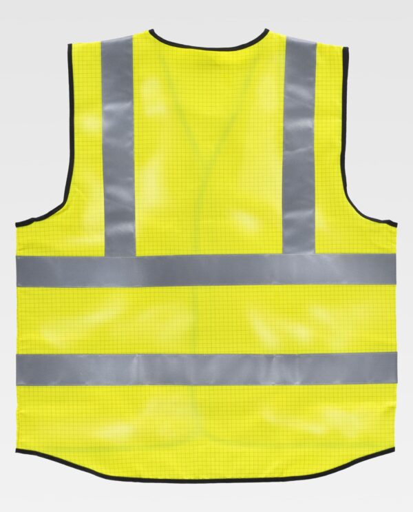 Colete antiestático de alta visibilidade com fitas refletoras. Decote em bico e fecho de velcro. Duas fitas refletoras nos ombros, peito e costas. Debruns a contraste.