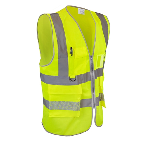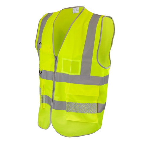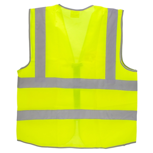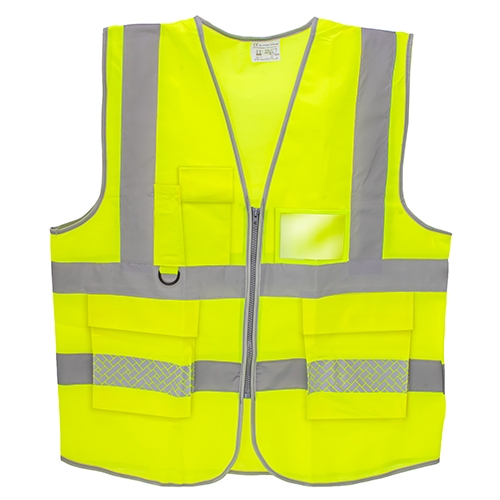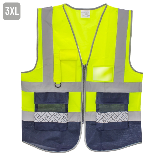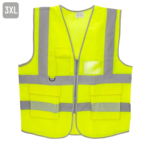 Colete de alta visibilidade.Inclui dois bolsos laterais (16 x 18,5 cm), um compartimento para cartões de identificação (10,5 x 7,2 cm) e um bolso com fecho de velcro (6,5 x 15 cm).Cada peça é embalada individualmente, comGuia de TamanhosL; 60 x 70 cm (largura x comprimento)3XL; 68 x 74 cm (largura x comprimento)
