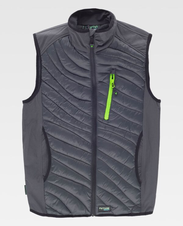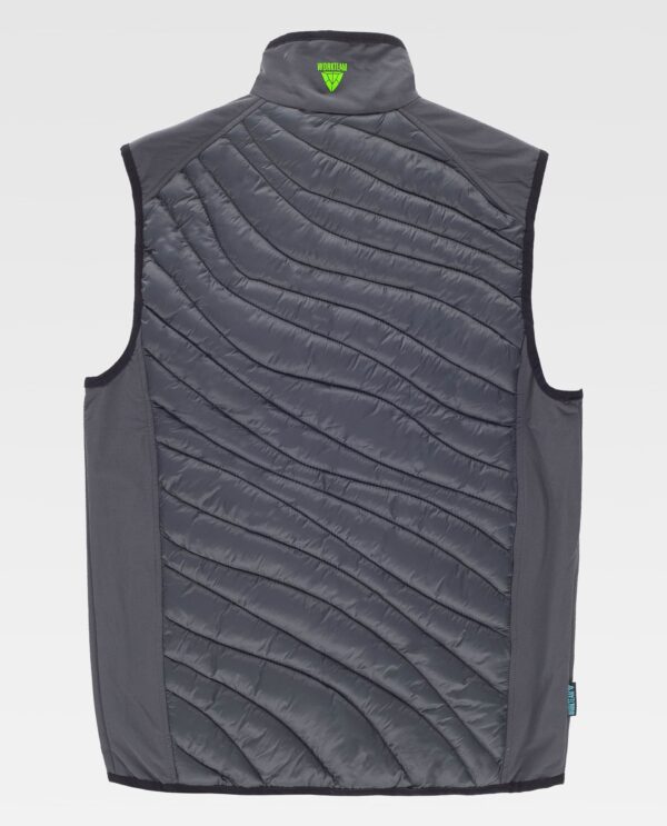 Colete de gola alta com tecido elástico combinado com tecido acolchoado. Fecho de correr. Aba protetora interior virada na parte superior, cobrindo o fecho de correr. Um bolso no peito e dois bolsos laterais interiores. Detalhes fluorescentes em contraste. Gola, cavas, bolsos e bainha com acabamento em viés elástico.