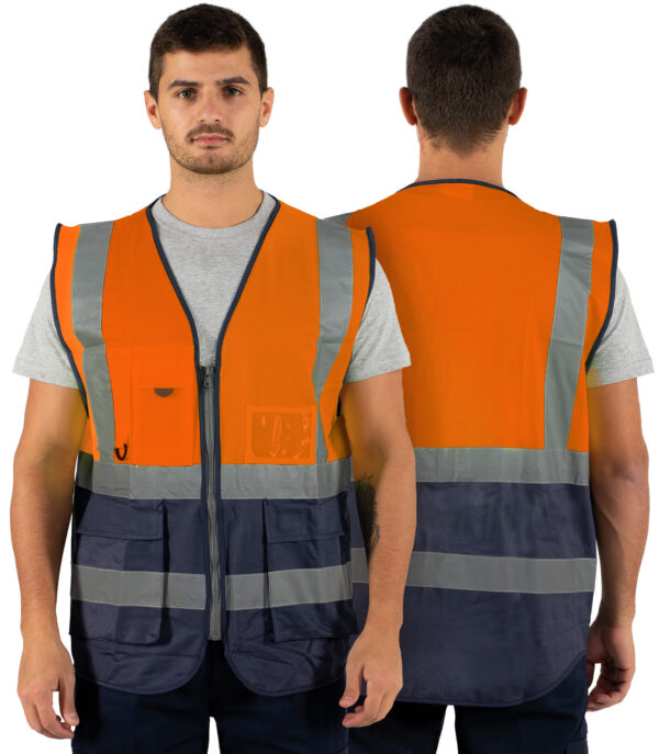 Colete refletor de alta-visibilidade e multibosos;100% Poliester;4 bandas refletoras;fecho zipper;3 bolsos + indentificador;Norma CE: EN ISO 20471:2013