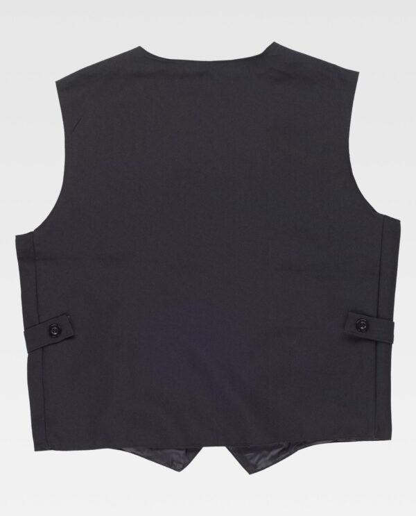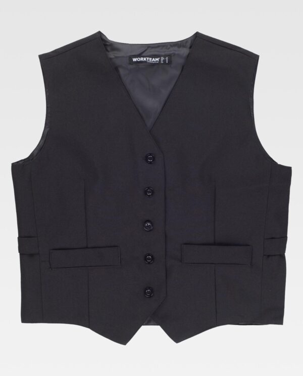 Colete entalhado de senhora de corte clássico. Decote em bico e fecho central simples com cinco botões do mesmo tom. Dois bolsos laterais semi-embutidos. Vincos e passadores decorativos com botão na cintura. Acolchoado. A sua composição em 100% poliéster garante a estabilidade dimensional do vestuário.