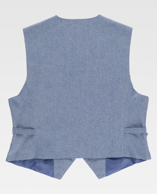 Colete de senhora em ganga. Decote em V e fecho de botões central. Um bolso no peito com botões. Ajuste por fivela metálica nos lados da cintura. Forrado.