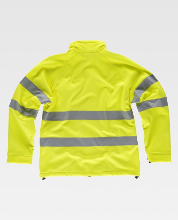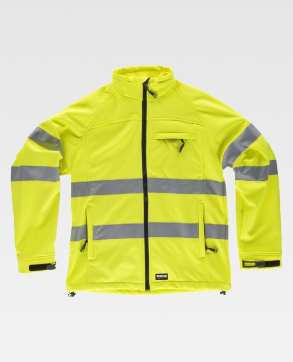 Colete Workshell de alta visibilidade com fitas refletoras. Gola alta e fecho de correr. Aba protetora interior com volta na parte superior protegendo o fecho de correr. Um bolso no peito e dois laterais interiores com fecho de correr. Duas fitas refletoras no peito, nas costas e nas mangas. Manga raglã e punhos ajustáveis com velcro. Cortes decorativos. Cordão elástico com peça ajustável no baixo. Tecido corta-ventos, repelente à água e resistente ao rasgo com membrana interior respirável e isolante no interior de alta capacidade térmica.
