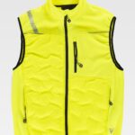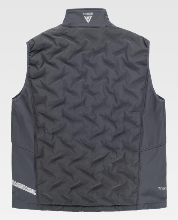 Colete Workshell combinado com tecido acolchoado selado e detalhes reflectores. Gola alta com fecho de correr em nylon. Aba protetora interior com volta na parte superior protegendo o fecho de correr. Um bolso no peito e dois bolsos laterais interiores com fecho de correr. Fita reflectora decorativa personalizada de um lado. Cavas com debrum elástico.