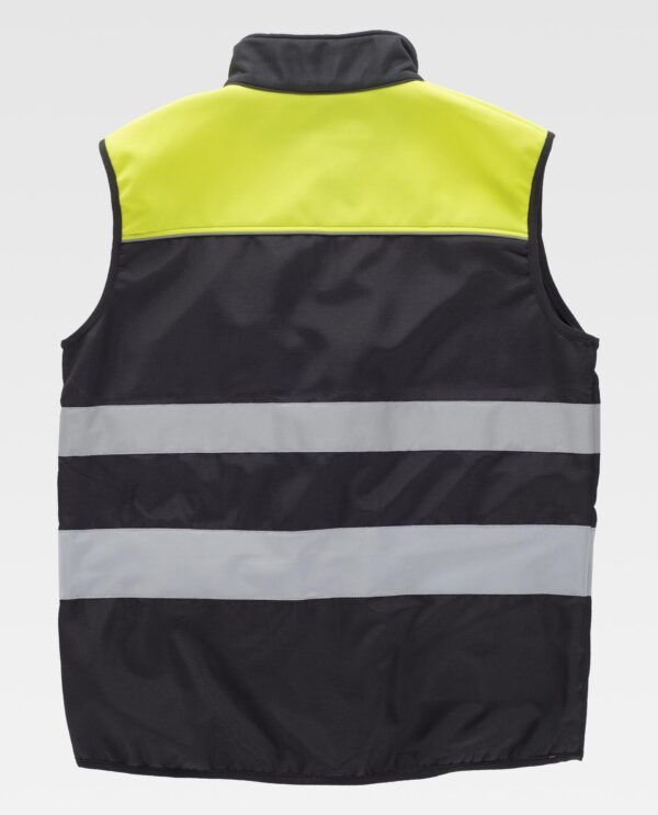 Colete Workshell com tecido Ripstop combinado, com corpetes e fitas refletoras. Gola alta e fecho de correr. Um bolso no peito e dois laterais interiores com fechos de correr. Um bolso de chapa com fecho de correr no interior. Duas fitas refletoras de diferente tamanho no peito e nas costas. Debruns refletores. Bainha. Tecido corta-ventos, repelente à água e resistente ao rasgo com membrana interior transpirável e isolante no interior de alta capacidade térmica.