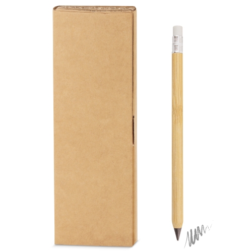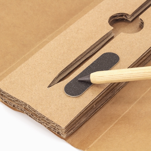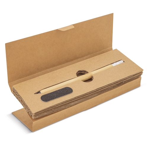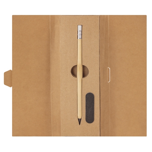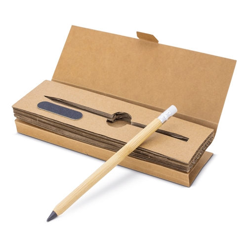 Set de cartão reciclado composto por um lápiz infinito, fabricado em bambú com borracha que não deixa residuos, lima para afiar a ponta e ter sempre a mesma como nova.