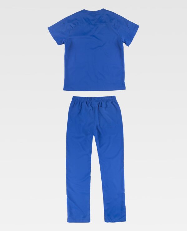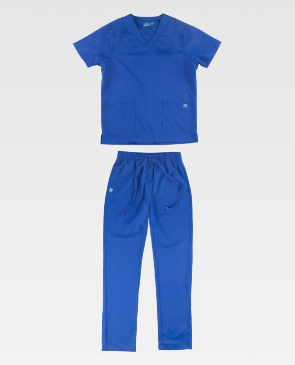 Conjunto unissex composto por casaco e calças em tecido de microfibra elástico bidirecional por construção.. Casaco de manga curta e gola em V. Aberturas laterais. Um bolso no peito de chapa. Dois bolsos de chapa laterais. Um bolso para canetas. Passador elástico no corpete dianteiro. Calças com elástico e cordão na cintura. Dois bolsos de chapa laterais. Um bolso de chapa traseiro,