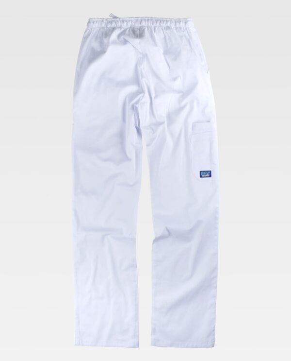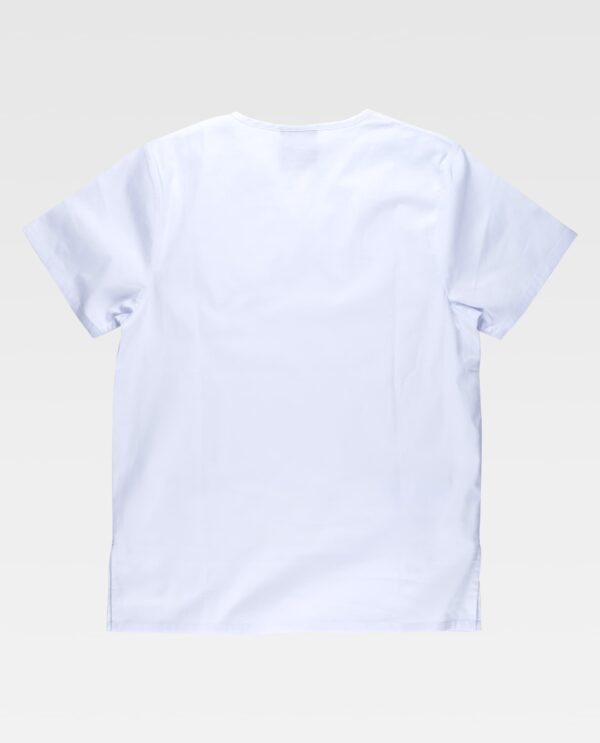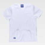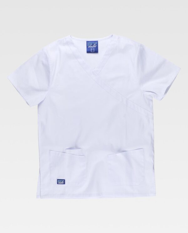 Conjunto unissexo de túnica e calça. Túnica de tecido elástico. Manga curta e gola em bico. Aberturas laterais. Três bolsos laterais de chapa. Um bolso para canetas. Calça elástica com elástico na cintura e cordão. Dois bolsos laterais. Dois bolsos de chapa na perneira.