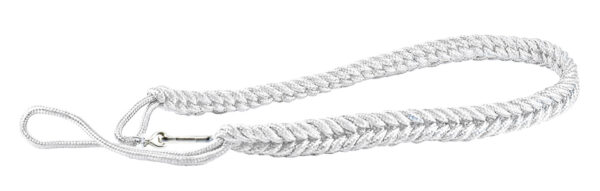 Cordão de gala grosso. Feito de cordão flexível e resistente. Duplo entrançado com laços em ambas as extremidades, um mais longo para passar através da almofada de ombro e um mais curto incluindo um clipe de metal para fácil fixação. Ideal para uniformes de segurança e fardas de gala.