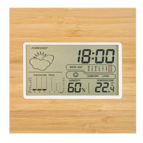 Realizado em bambú natural, ideal para escritórios, salas de computadores, vivendas, estufas etc..Temperatura Max/MinHumidade Max/MinTemperaturaAlarmeHoraCalendarioIndicador nivel de confortoCom suporte mesa e para colocar na parede2 pilhas AAA (Nao incluidas)