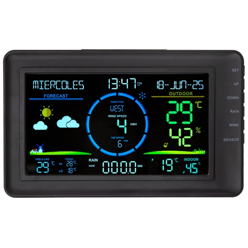 Ecrã claro e intuitivo que permite visualizar a previsão do tempo a qualquer momento, tanto em ambientes interiores como exteriores.